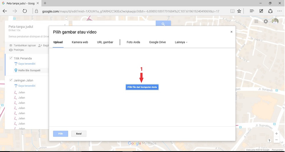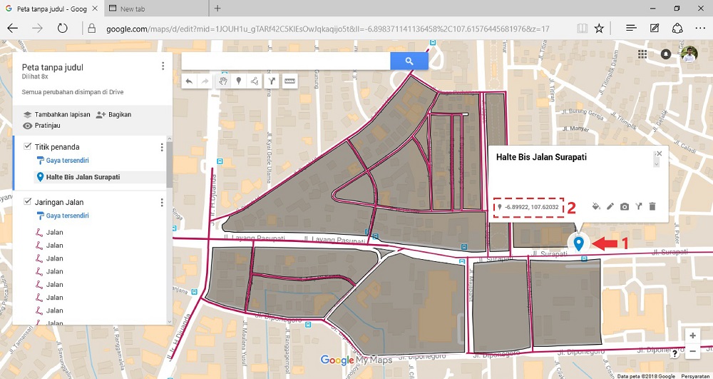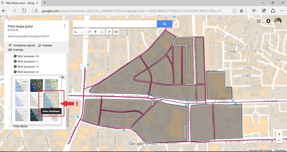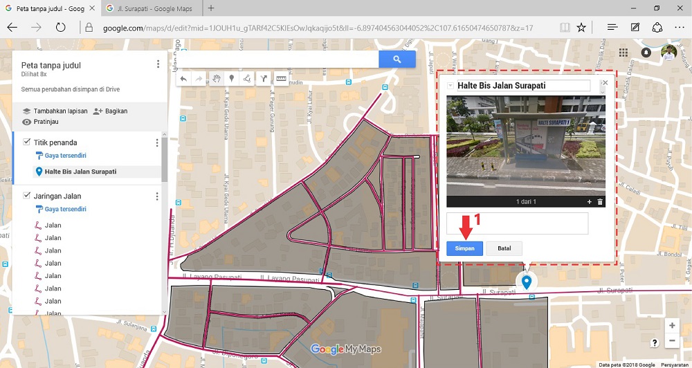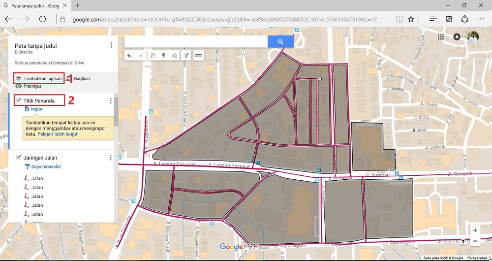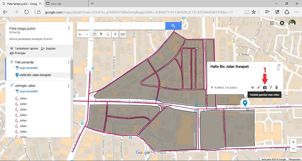 Pada artikel cara membuat Digitasi Peta menggunakan Google My Maps [Bagian I], telah dibahas tentang bagaimana melakukan digitasi peta pada jaringan jalan dan area blok kawasan melalui aplikasi Google My Maps. Kemudian untuk langkah selanjutnya bagaimana cara menambahkan keterangan berupa penanda serta penambahan foto pada area-area tertentu?
