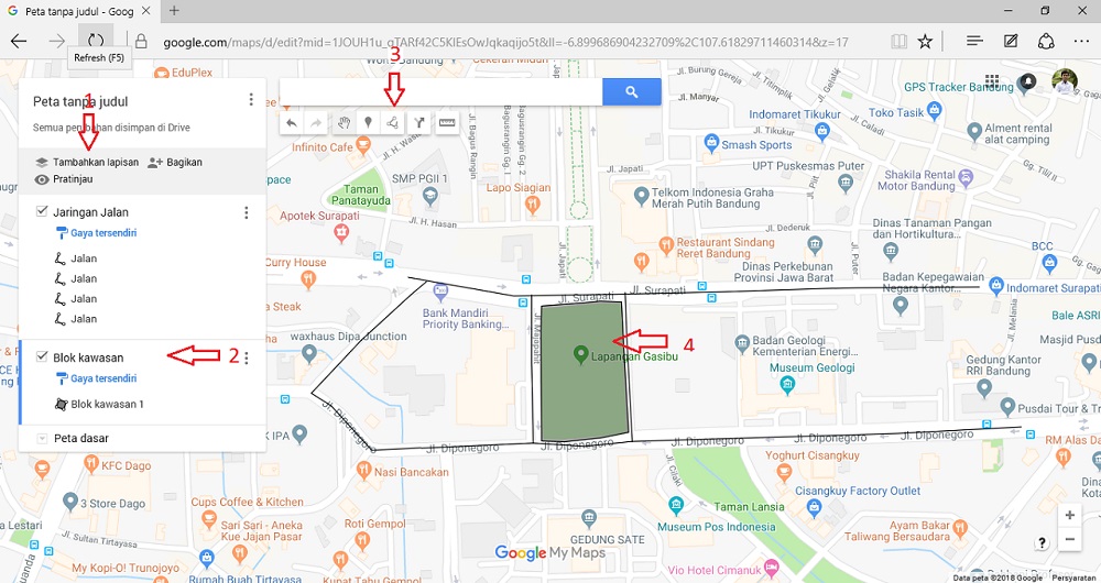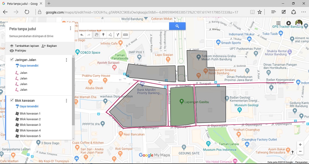 Selain melakukan digitasi blok kawasan dan jalan, Google My Maps ini juga menyajikan beberapa fitur tambahan untuk pemetaan, seperti penambahan titik sebagai penanda untuk lokasi yang khas, penambahan foto kawasan, penambahan penunjuk arah dan rute transportasi, serta peta ini dapat dicetak atau diekspor dalam format kml/kmz.