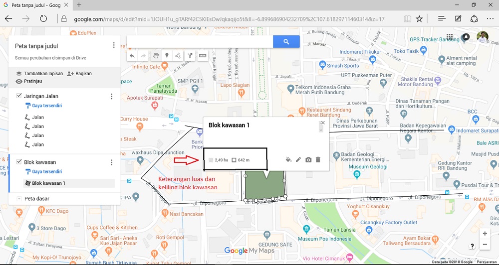 8. Dari blok dan jalan yang dibuat, tertera keterangan terkait berapa panjang jalan yang dibuat serta luasan blok yang di digitasi.