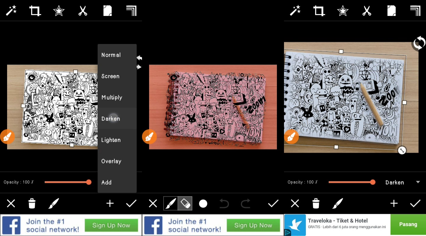 4. Sesuaikan ukuran Doodle Art dengan gambar latar kosong. Setelah itu, pada pilihan efek gambar, klik efek “Normal” lalu pindahkan pada “Darken“. Lalu anda gunakan tombol kuas untuk menghapus gambar-gambar yang keluar garis, pastikan pilihan itu mengarah pada icon penghapus.