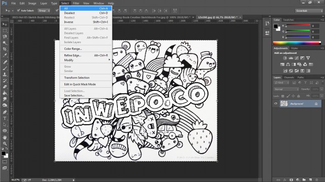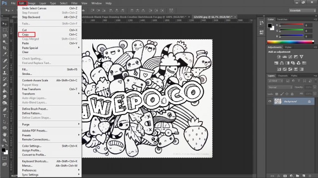 7. Selanjutnya klik pada munu Select > All, lalu klik menu Edit > Copy, langkah ini bertujuan untuk menyalin doodle art.