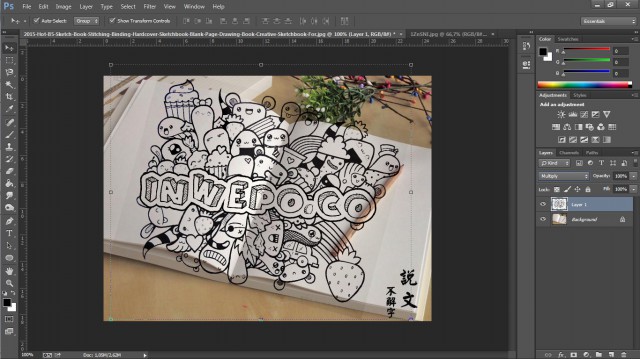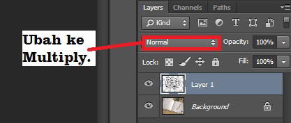 8. Langkah menyalin doodle art sudah selesai, selanjutnya arahakan kursor ke jendela gambar kertas polos, lalu klik menu Edit > Paste. Setelah itu ubah efek Normal menjadi Multiply, bertujuan agar warna doodle art menyatu dengan warna kertas polos tersebut.