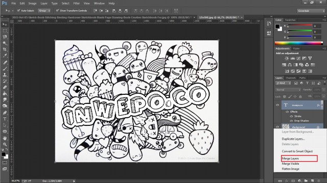 6. Langkah berikutnya, pada jendela layer arahkan kursor ke layer tulisan dan block layer tulisan dan layer background-nya, lalu klik kanan dan pilih Merge Layers. Langkah ini bertujuan agar layer background dan layer tulisan tidak akan terpisah jika di paste-kan ke gambar kertas polos.
