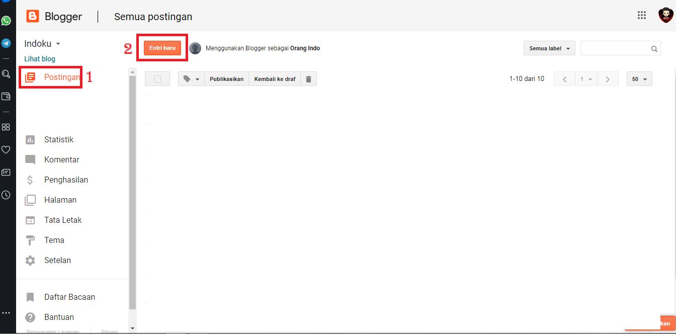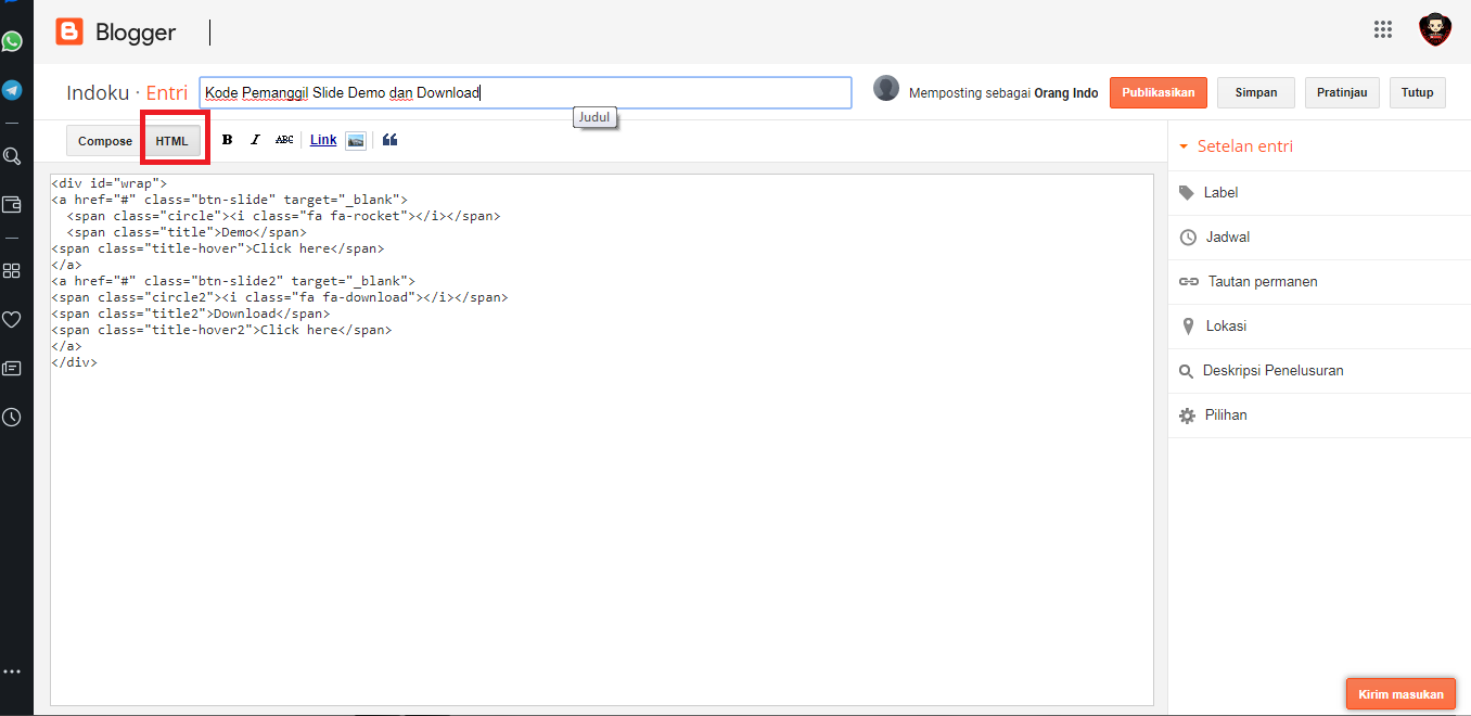 4. Untuk langkah selanjutnya pilih Postingan – Entri Baru – Html – Lalu masukan kode pemanggil di bawah ini.