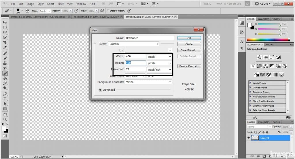 Buka aplikasi Photoshop, kemudian buat layer baru dengan cara Klik File – New dan atur nilainya jangan terlalu besar maximal ukurannya 400 x 400 dan usahakan bentuk panjang dan lebarnya sama tau berbentuk persegi.