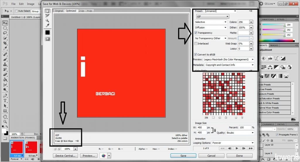 jika dirasa cukup langkah selanjutnya simpan gambar tersebut, Klik File – Save For Web & Device, atur pengaturannya seperti gambar di bawah, kemudian klik save.