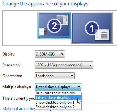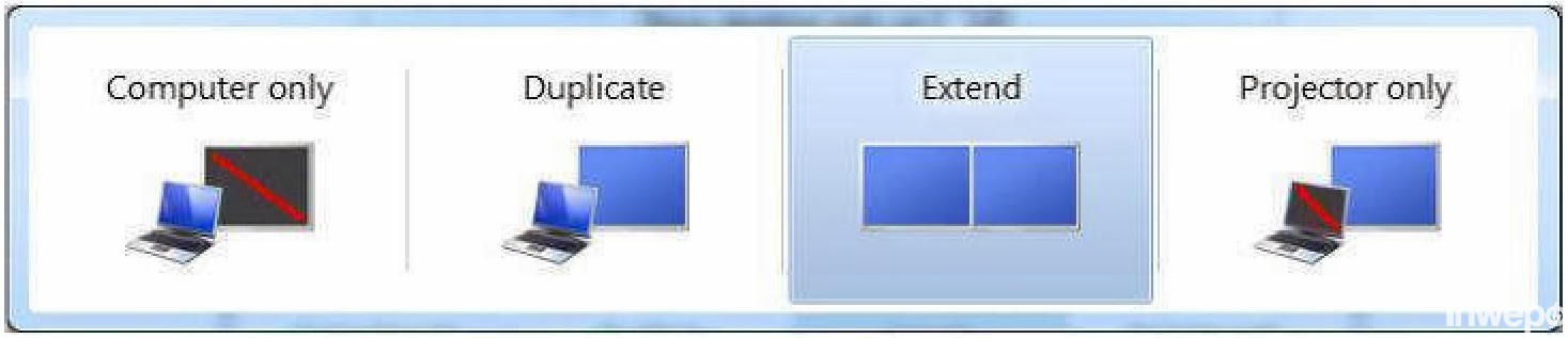 Anda dapat memilih untuk hanya menampilkan komputer (Computer Only), membuat monitor kedua duplikat yang pertama (Duplicate), memperluas desktop ke monitor kedua (Exetend) atau mematikan monitor pertama dan mengaktifkan kedua (Projector Only). Kemudian Anda pilih yang Extend.
