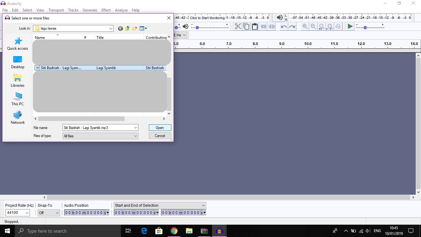 2. Masukkan musik atau lagu yang ingin di edit. Klik File – Import – Audio.