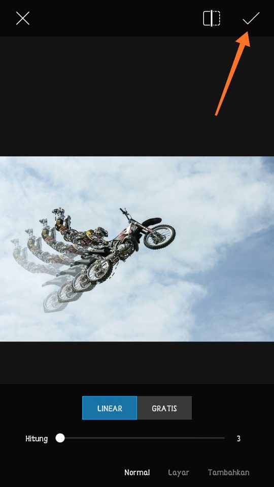 4. Pilih jenis pola bayangan bisa linear atau gratis (arti sebenarnya adalah bebas, pihak aplikasi salah mengartikan maksud free di dalam Bahasa Indonesia), atur jumlah bayangan yang ingin dihasilkan, jika sudah selesai melakukan pengaturan, tap ikon centang di pojok kanan atas pada layar.