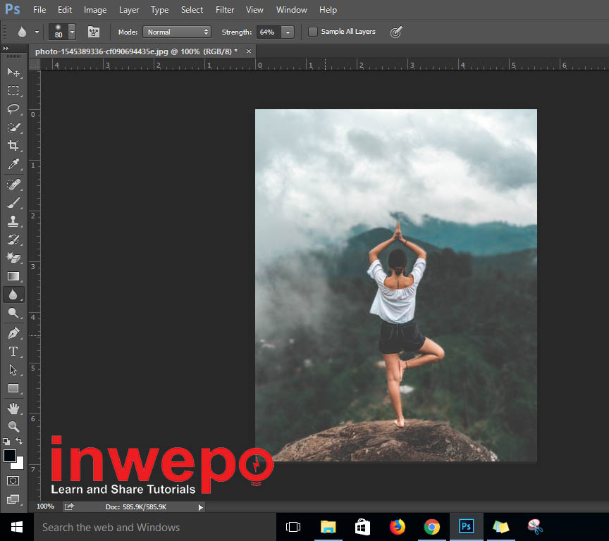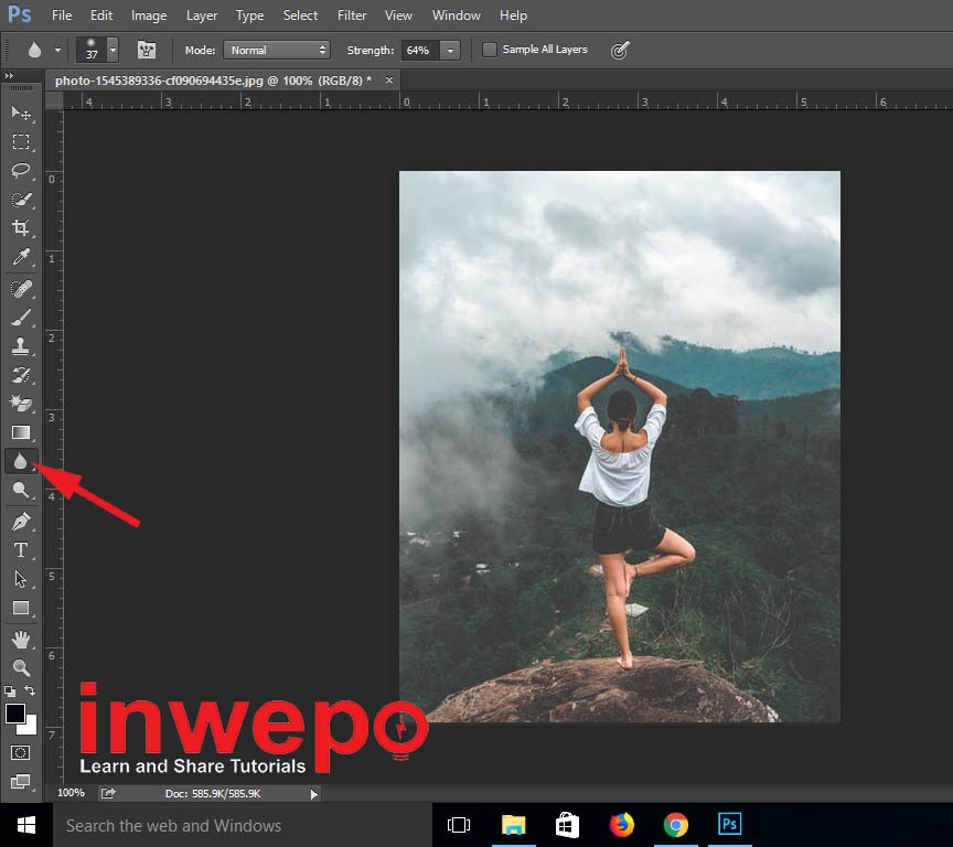 2. Klik blur tool pada toolbox di bagian kiri – Mulai membuat efek blur pada objek tertentu yang kamu kamu. (penulis akan membuat efek blur pada bagian hutan dan pepohonan)