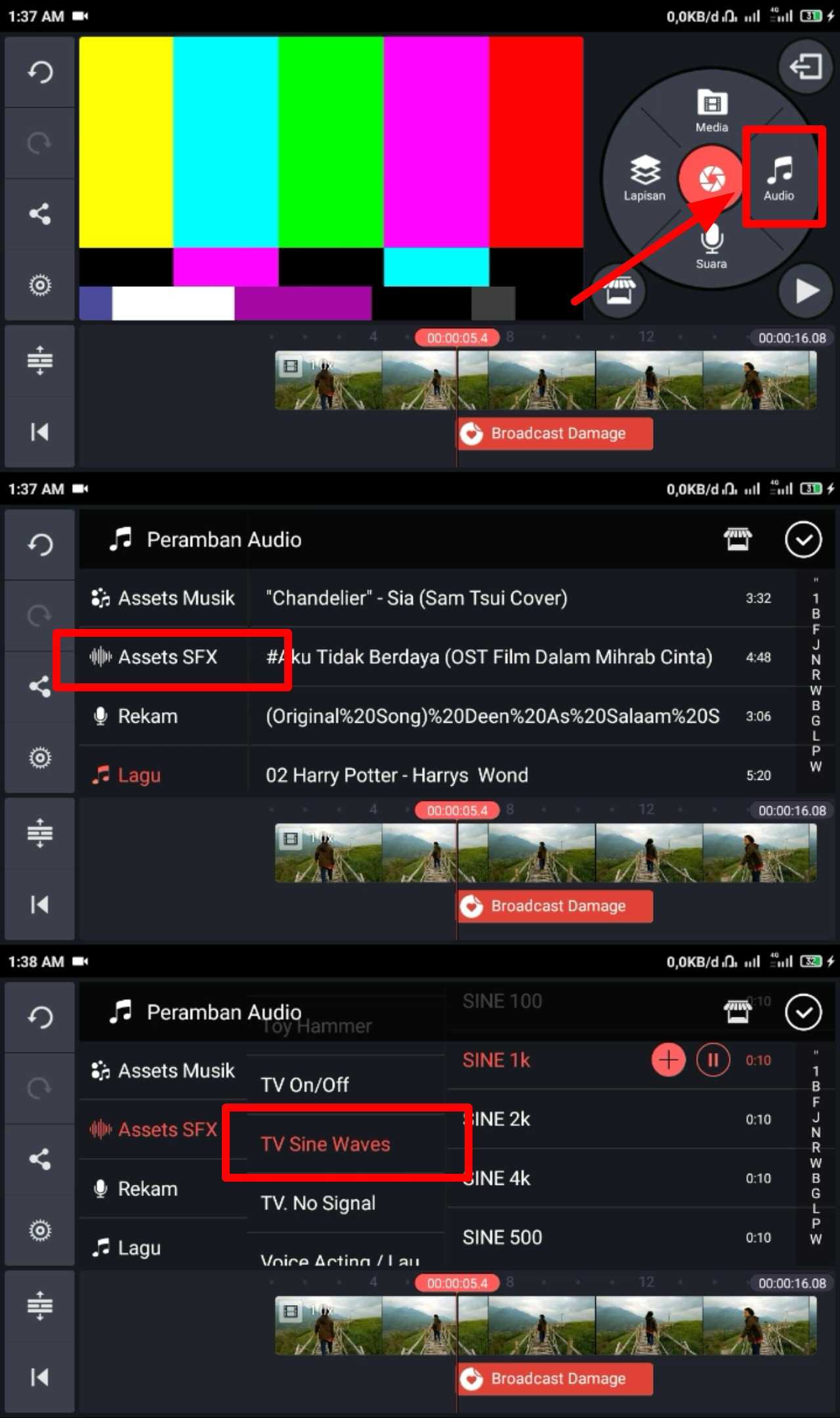 5. Setelah tersisipkan, kamu atur posisi effect tersebut, dan jangan lupa tambahkan audio effectnya. Semacam suara yang tepat untuk sebuah siaran yang rusak. Caranya ketuk menu audio, lalu pilih Asset SFX. Apabila kamu belum memiliki sound efect, kamu bisa mengunduhnya seperti saat mengunduh effect sebelumnya.