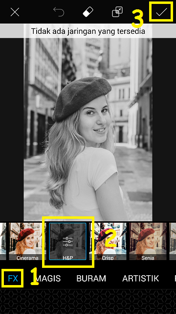 Pilih ‘FX’ – ‘B&W’ – klik centang.
