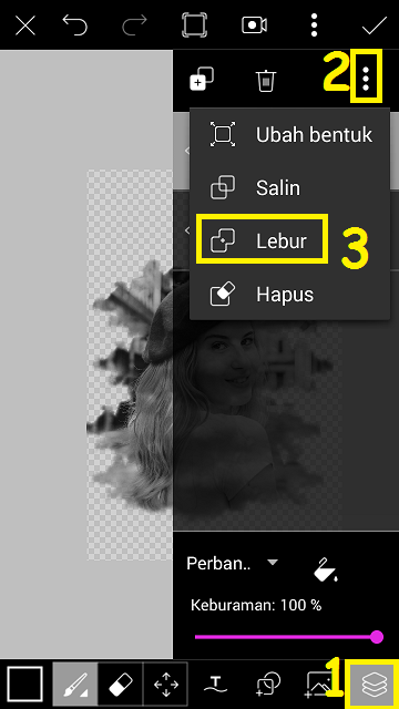 7. Gabungkan foto objek dan foto cloud dengan pilih ‘Lapisan’ – titik tiga – ‘Lebur’.