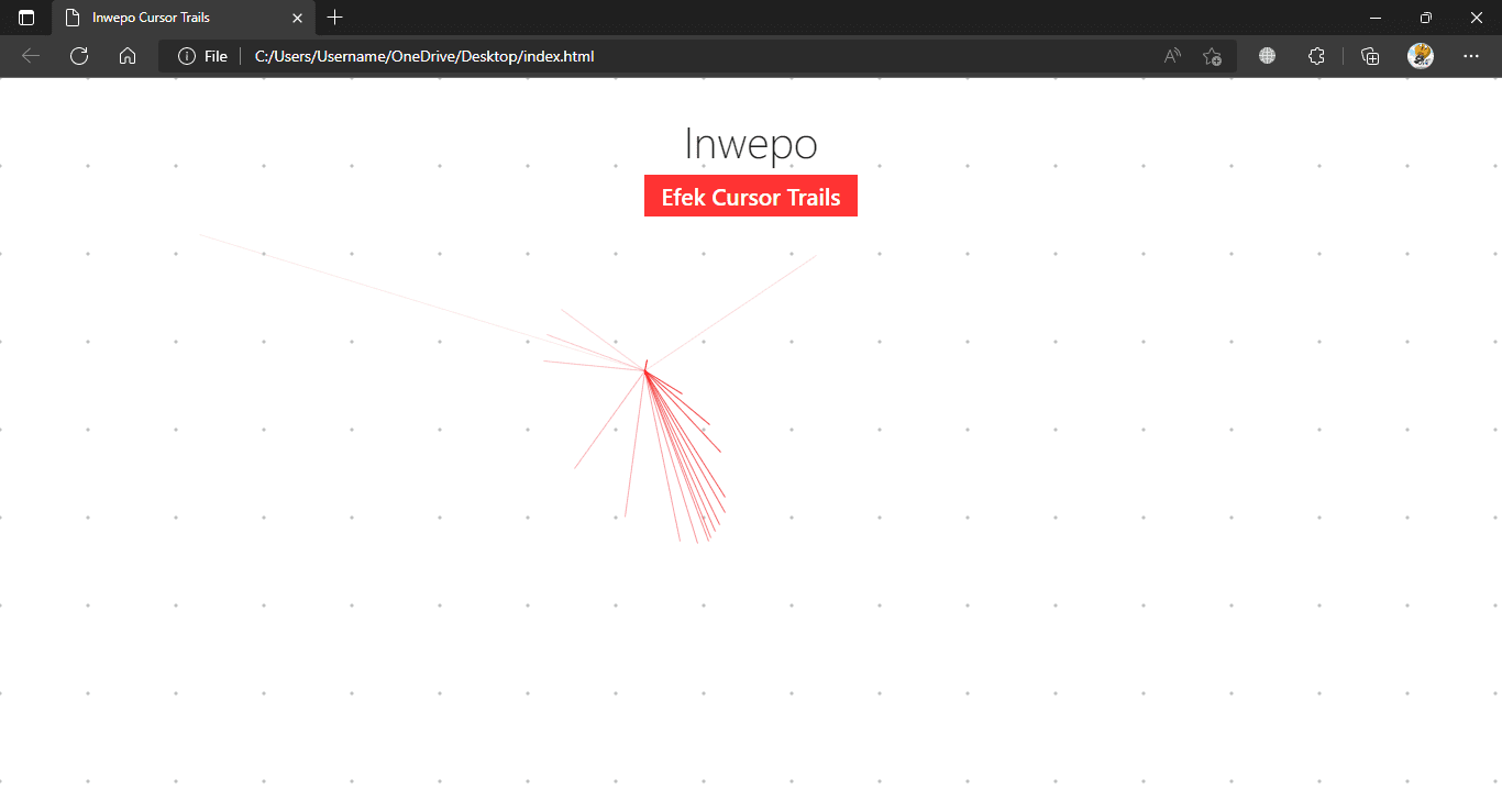 5. Save file yang telah dimodifikasi sebelumnya. Lalu, buka file index.html melalui browser kamu. Nantinya, halaman website akan tampak kosong dengan hanya berisikan beberapa teks tambahan yang berada pada tengah halaman. Hanya saja, ketika kamu menggerakan kursor kedalam halaman website, efek garis berwarna akan mengikuti gerakan kursor-mu, mengindikasikan bahwa penerapan efek cursor trail telah berhasil diterapkan.