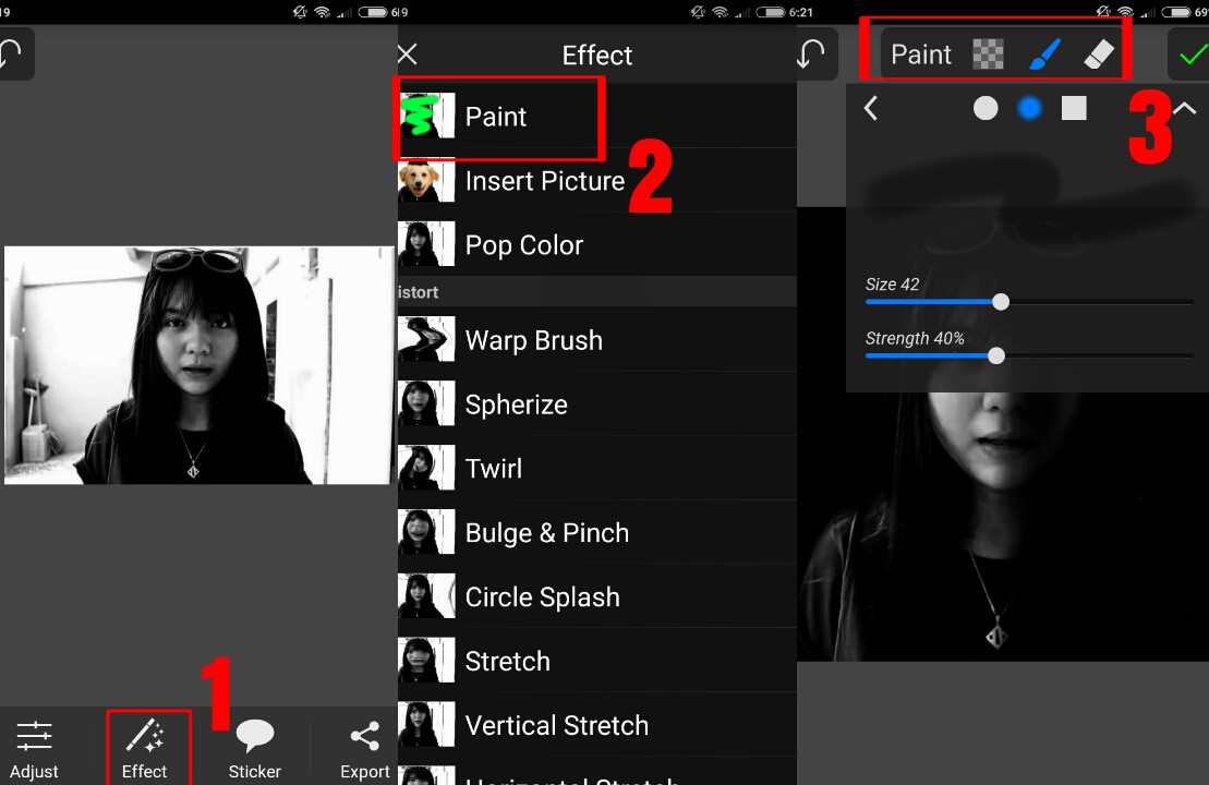 5. Lanjutnya, setelah berhasil menambahkan efek pop color, pilih menu Effects – Paint. Pilih warna hitam, lalu atur size dan strength nya.