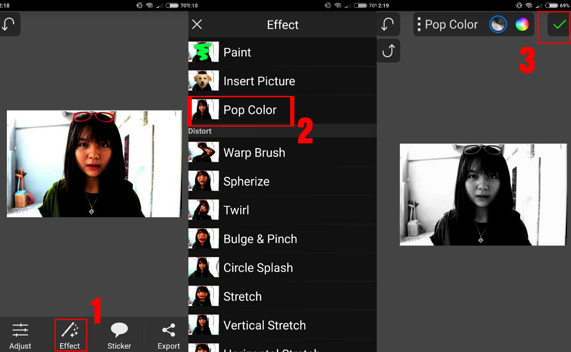 4. Selanjutnya kamu pilih menu Effects – Pop Color – Pilih tanda ‘√’
