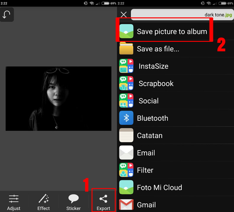 Langkah terakhir kamu hanya perlu menyimpan hasil editing tadi. Pilih menu Export – Save picture to album.