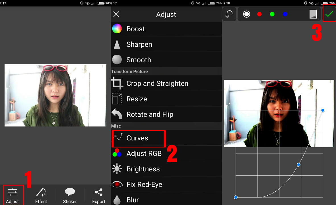 3. Setelah foto berhasil dimasukan, kamu pilih menu Adjust – Curves. Atur tonenya, kamu bisa ikuti sesuai foto di bawah. Atau atur sesuai selera kamu. Setelah di rasa sudah pas, pilih tanda centang ‘√’