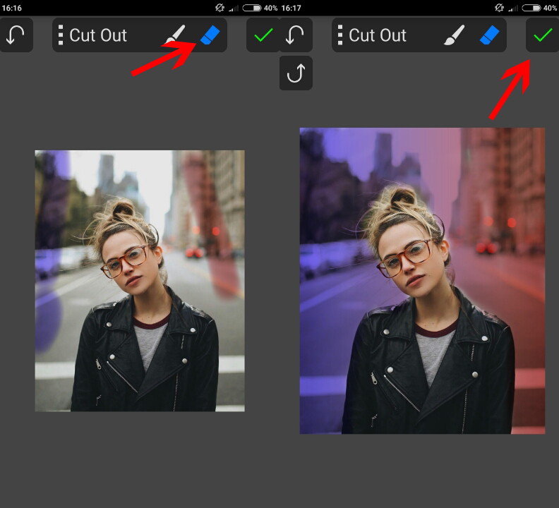 Pilih tanda Penghapus. Hapus bagian backgroundnya. Setelah selesai, pilih tanda Centang.