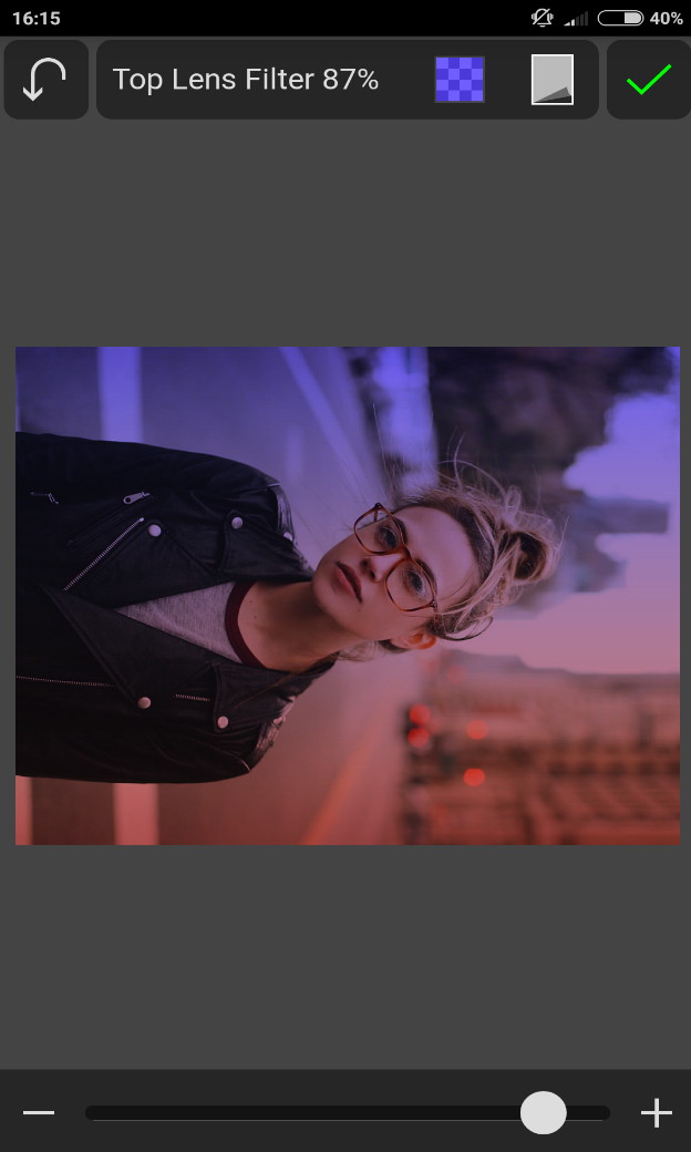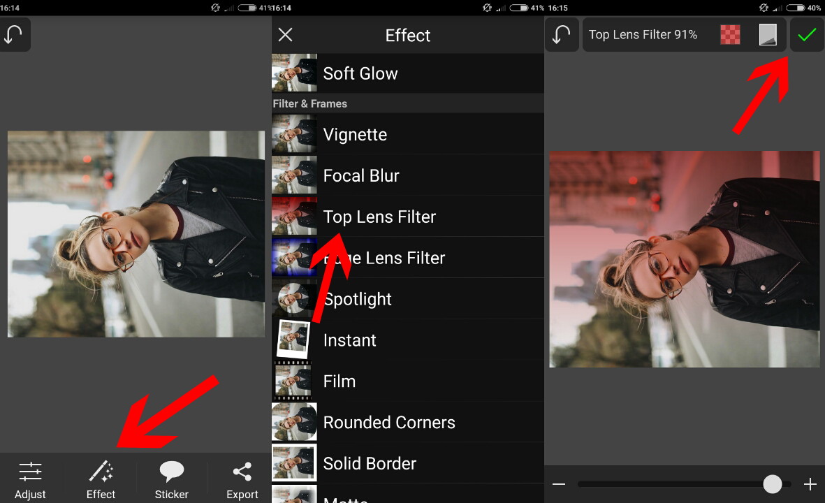 4. Langkah berikutnya pilih menu Effect – Top Lens Filter. Kamu atur warna serta opacitynya sesuai selera, atau bisa ikuti seperti gambar di bawah ini. Setelah selesai pilih tanda Centang.