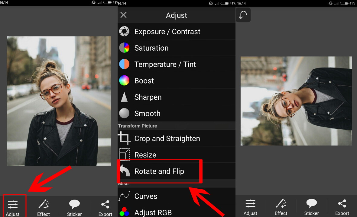 3. Selanjutnya, pilih menu Adjust – Rotate and Flip. Putar 90° ke arah kiri.