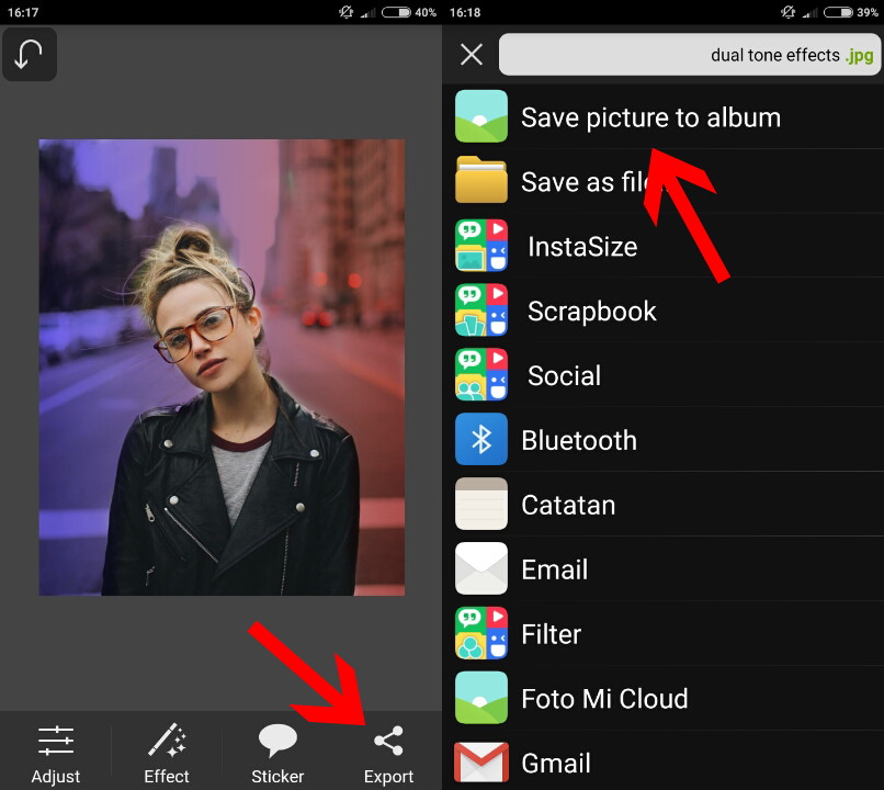 Langkah terakhir kamu hanya perlu menyimpan hasil editingnya. Pilih Export – Save picture to Album.