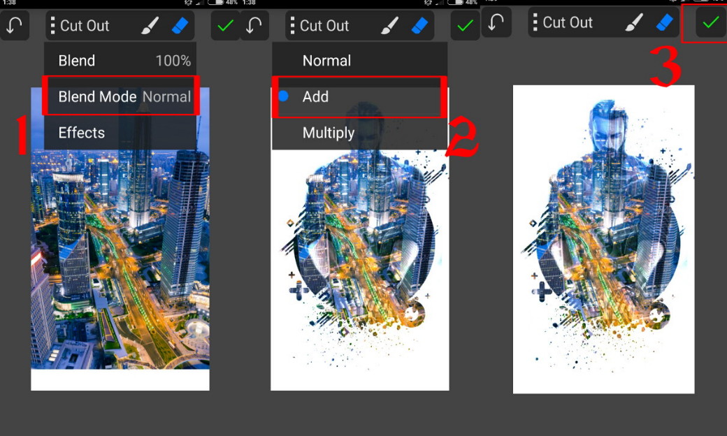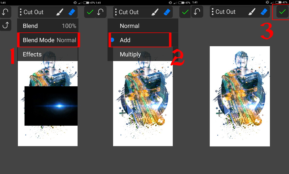 4. Langkah ke empat masukan foto mentahan Kota. Tutupi semua bagian foto dengan mentahan itu. Pilih Titik tiga – Blend mode – Add.