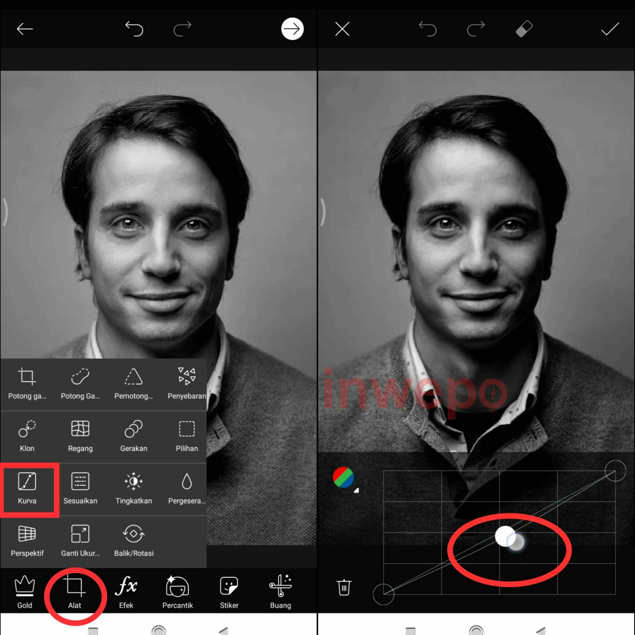 3. Tap menu Alat dan pilih Kurva, turunkan kecerahannya sedikit kebawah. tap ceklis di bagian atas kemudian simpan foto.