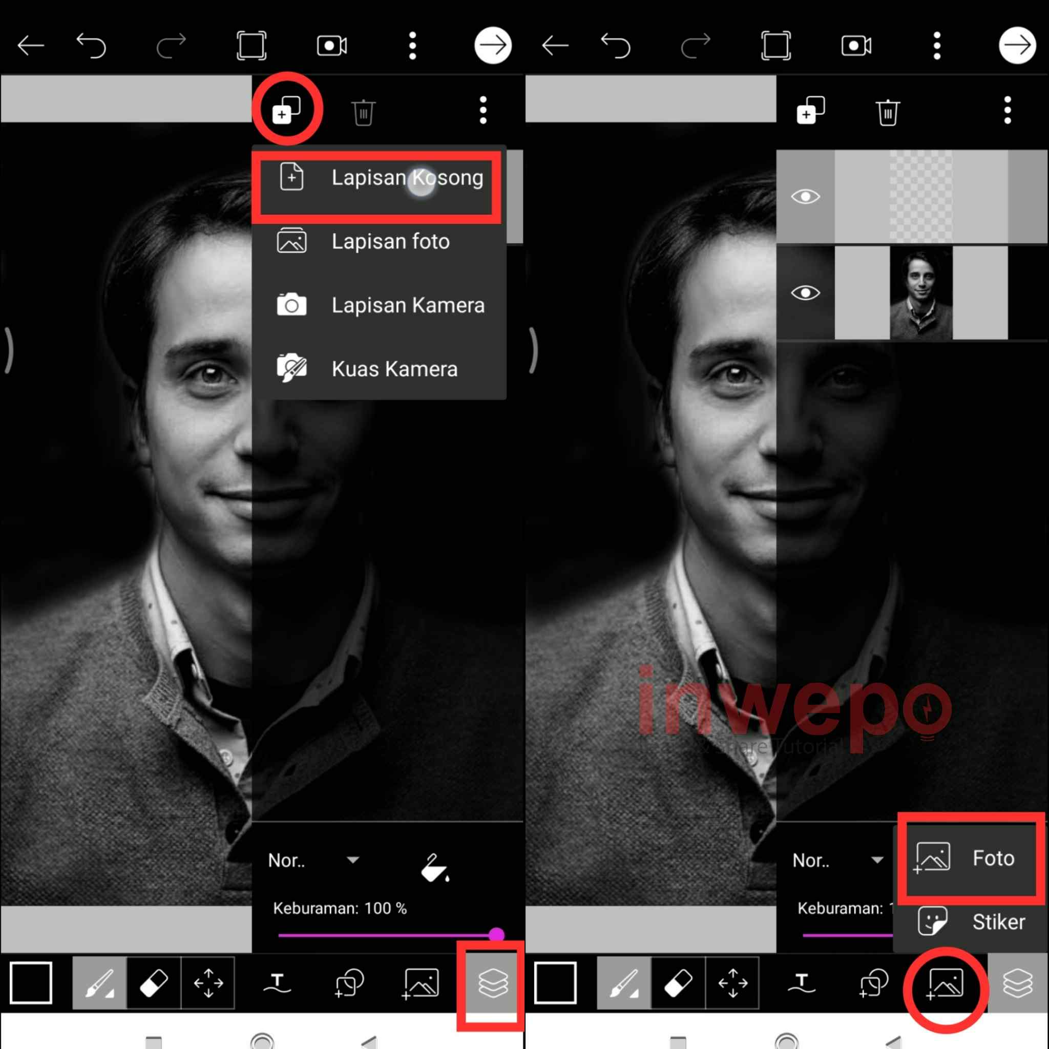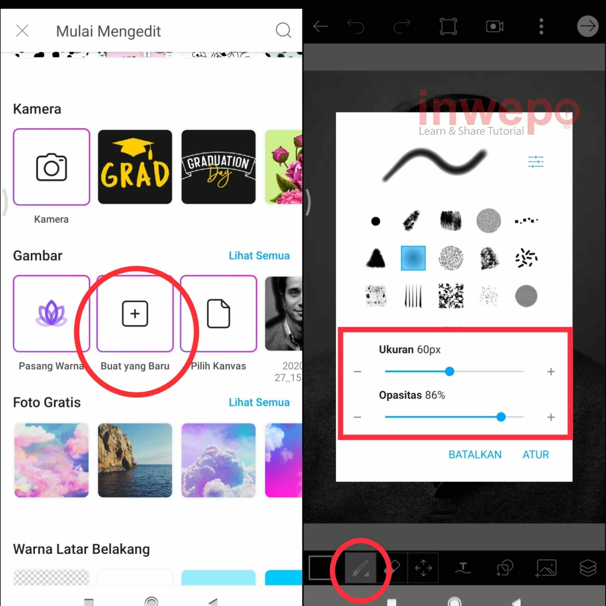 4. Tap menu Buat yang Baru, jangan lupa untuk memasukkan photo hitam putih yang sudah kita edit sebelumnya. Pilih icon brush dan atur brush yang akan kamu gunakan, pastikan untuk memilih warna hitam. Selanjutnya sapukan pada bagian background hingga semua tertutupi.