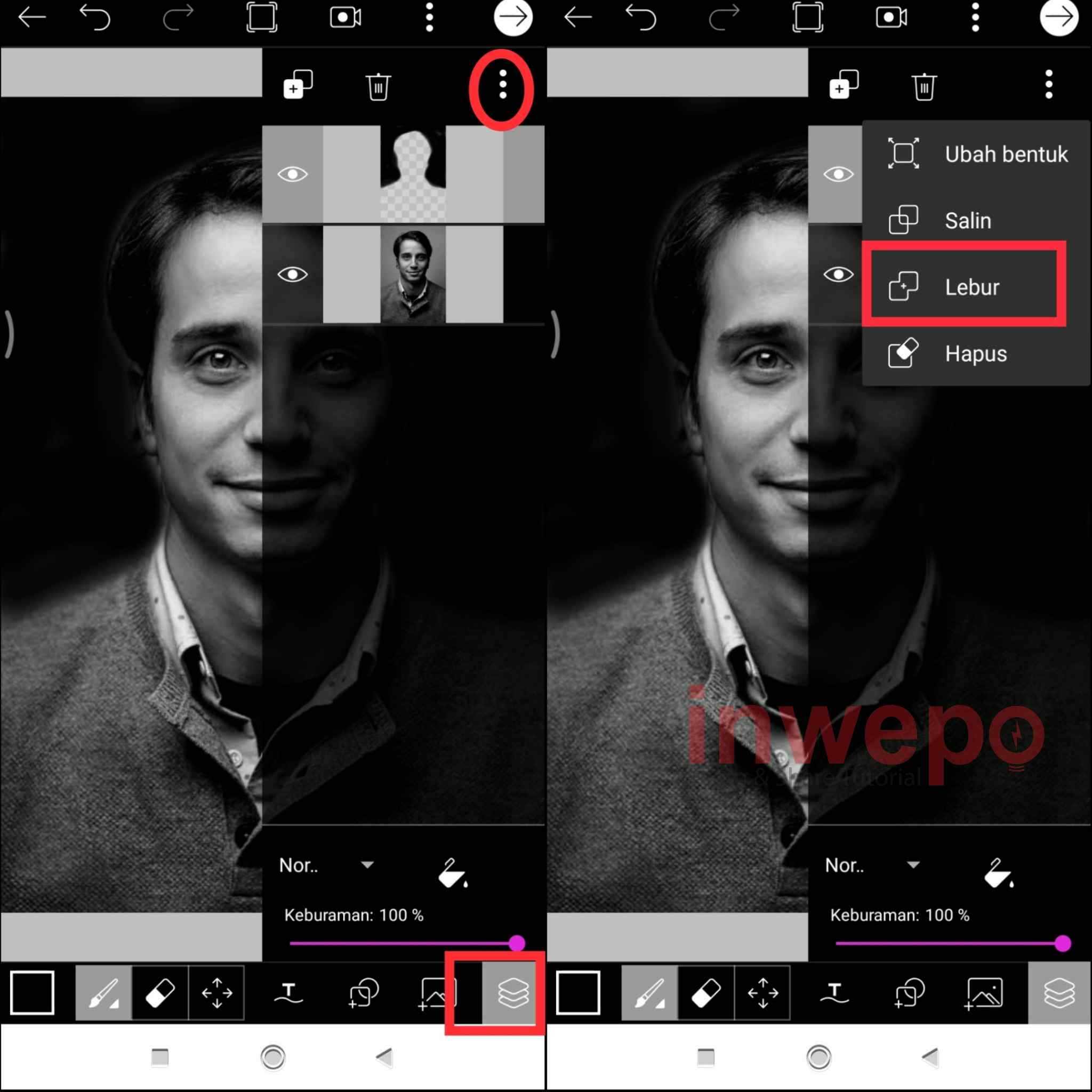 5. Tap menu layer yang berada di pojok kanan lalu pilih 3 titik, kemudian pilih menu Lebur untuk menyatukan background yang berwarna hitam dengan photo.