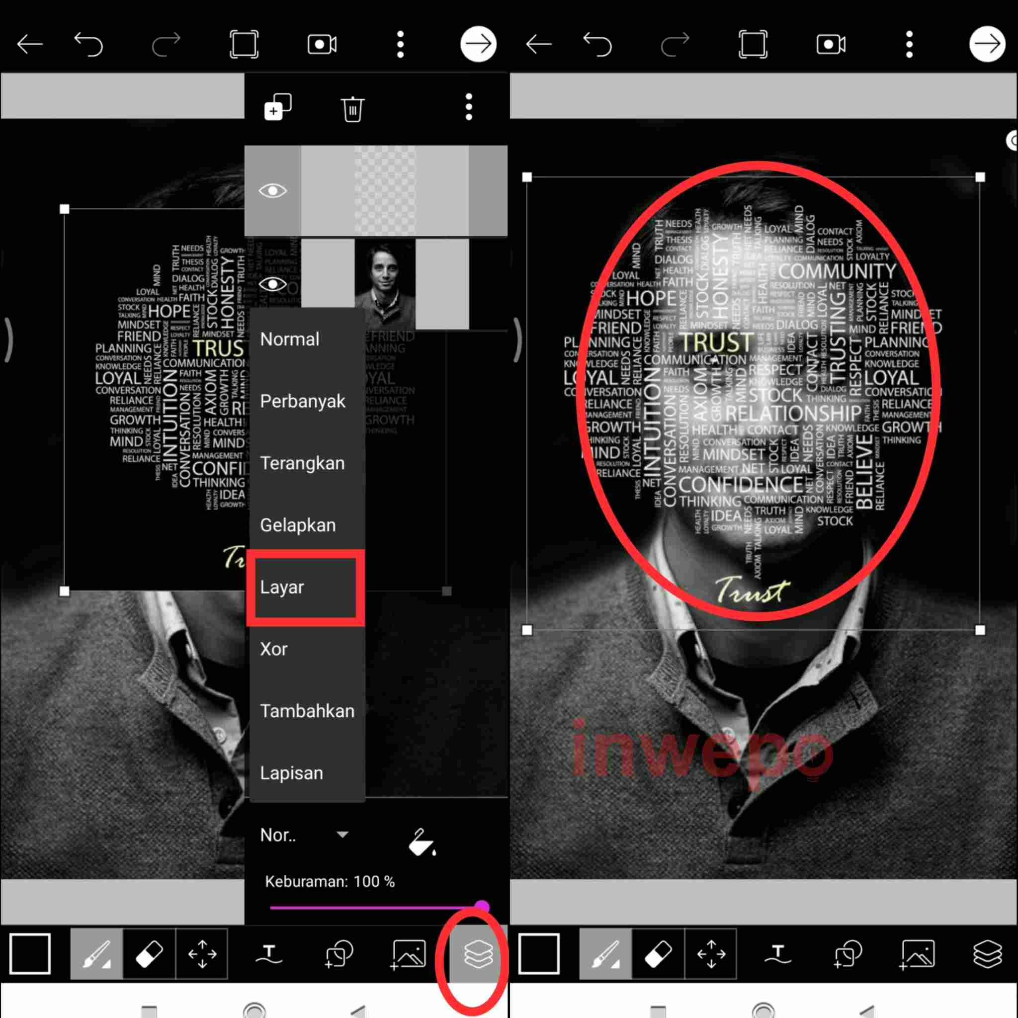 7. Atur dan tempatkan gambar tulisan di bagian potrait satu persatu mulai dari wajah hingga badan jangan lupa untuk tap menu layer dan ubah blending mode nya menjadi Layar.