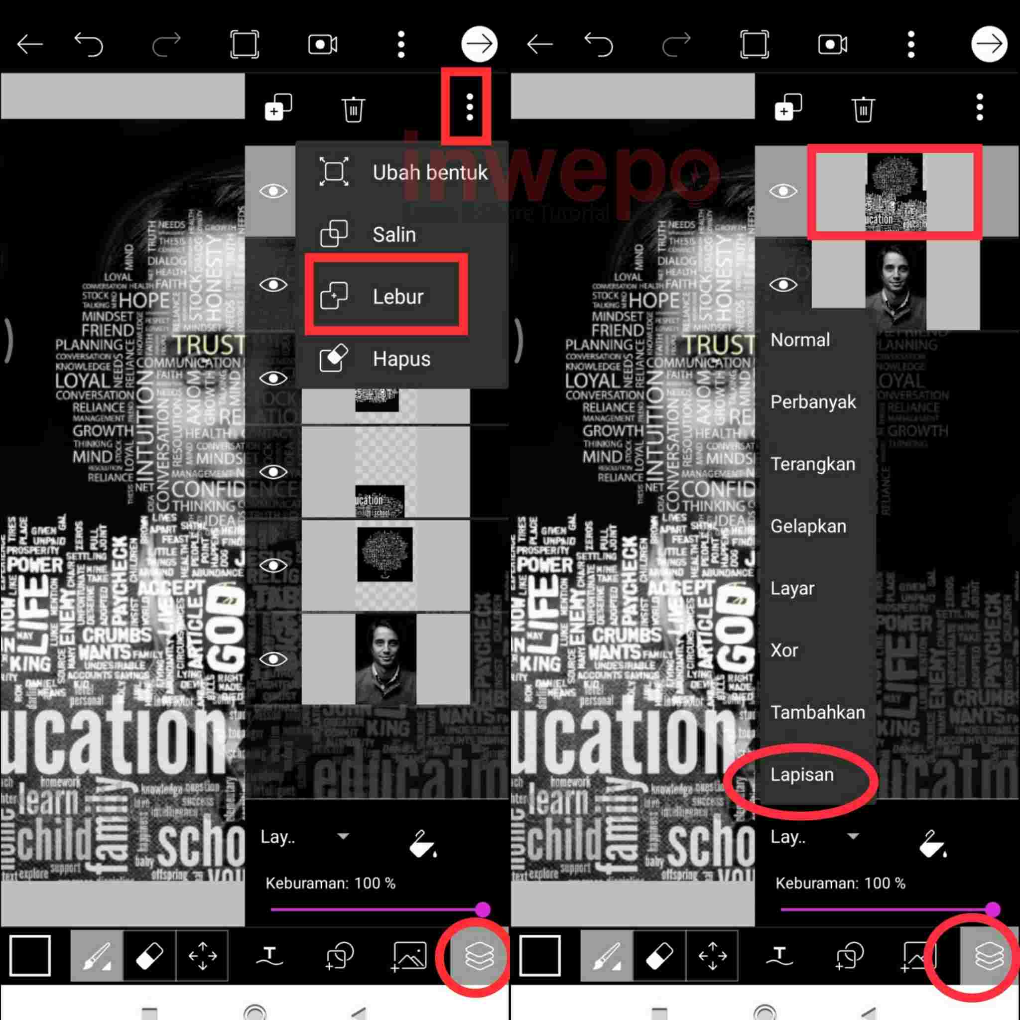 8. Satukan semua gambar text dengan cara tap menu layer kemudian tap 3 titik lalu pilih lebur. Lakukan satu persatu hingga semua gambar text menjadi satu. Jika sudah semua ubah blending modenya menjadi Lapisan.
