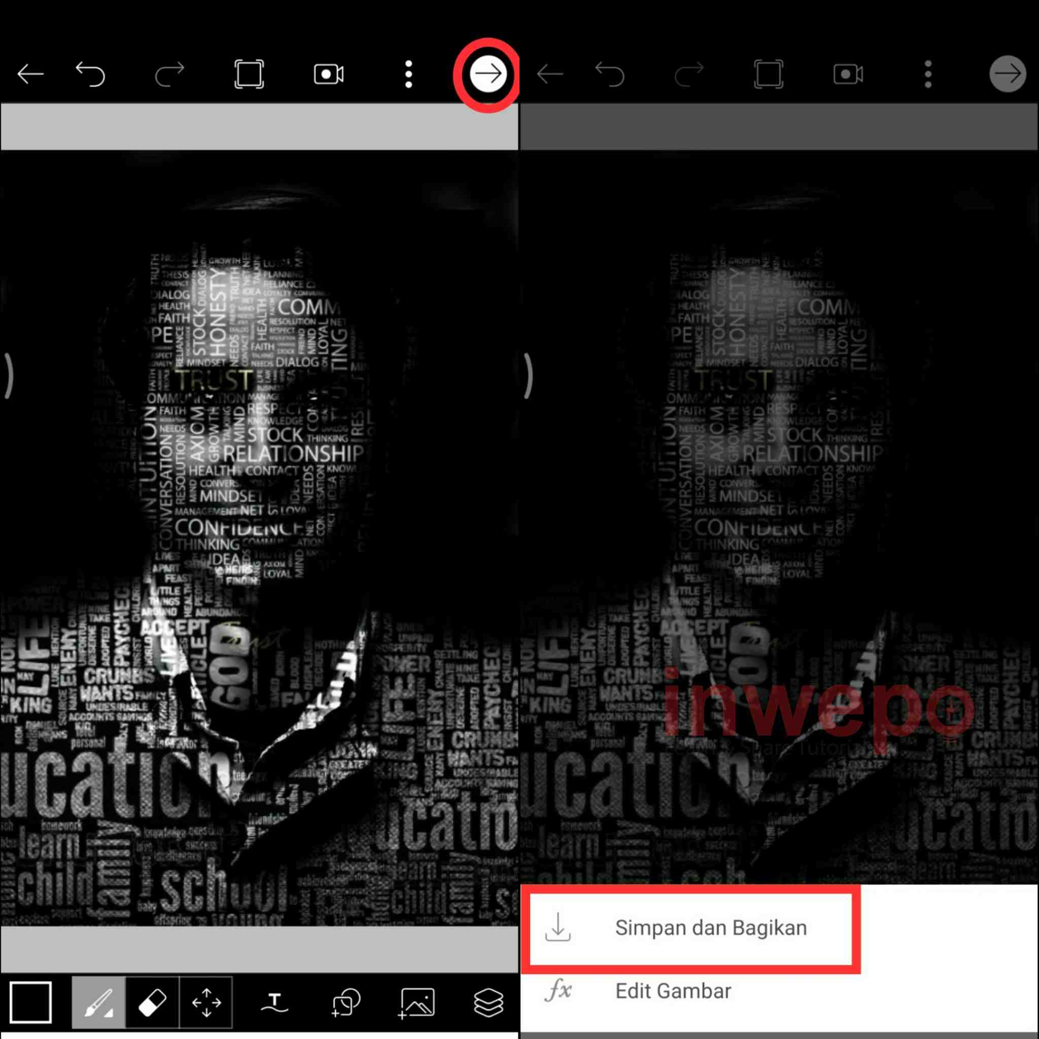 9. Hasil akhirnya akan seperti gambar di bawah ini, tap icon arrow kemudian tap Simpan dan Bagikan untuk menyimpan hasil editan ke dalam galeri smartphone.