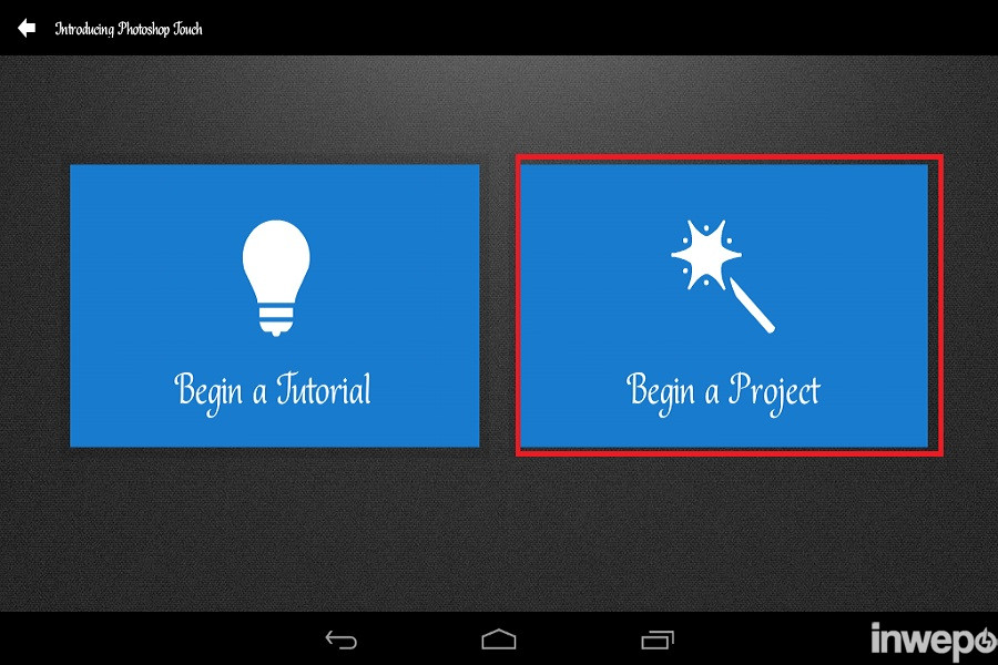 Buka aplikasi Photoshop Touch yang telah di-download, kemudian tekan bagian tulisan Begin a Project
