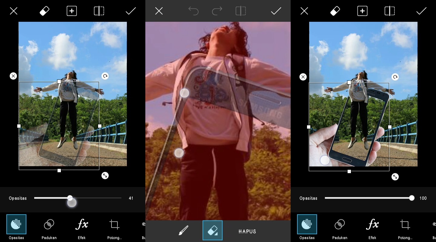 5. Atur posisi bingkai dengan objek. Atur Opasitas gambar untuk memudahkan penghapusan objek dengan bingkai. Lalu gunakan tool erase dan hapus sebagian bingkai yang menghalangi objek.