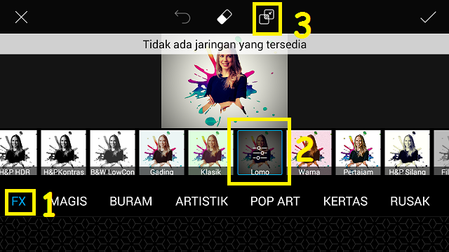 Pilih ‘FX’ – ‘Lamo’. Klik menu ‘Blend’, untuk menambahkan efek.