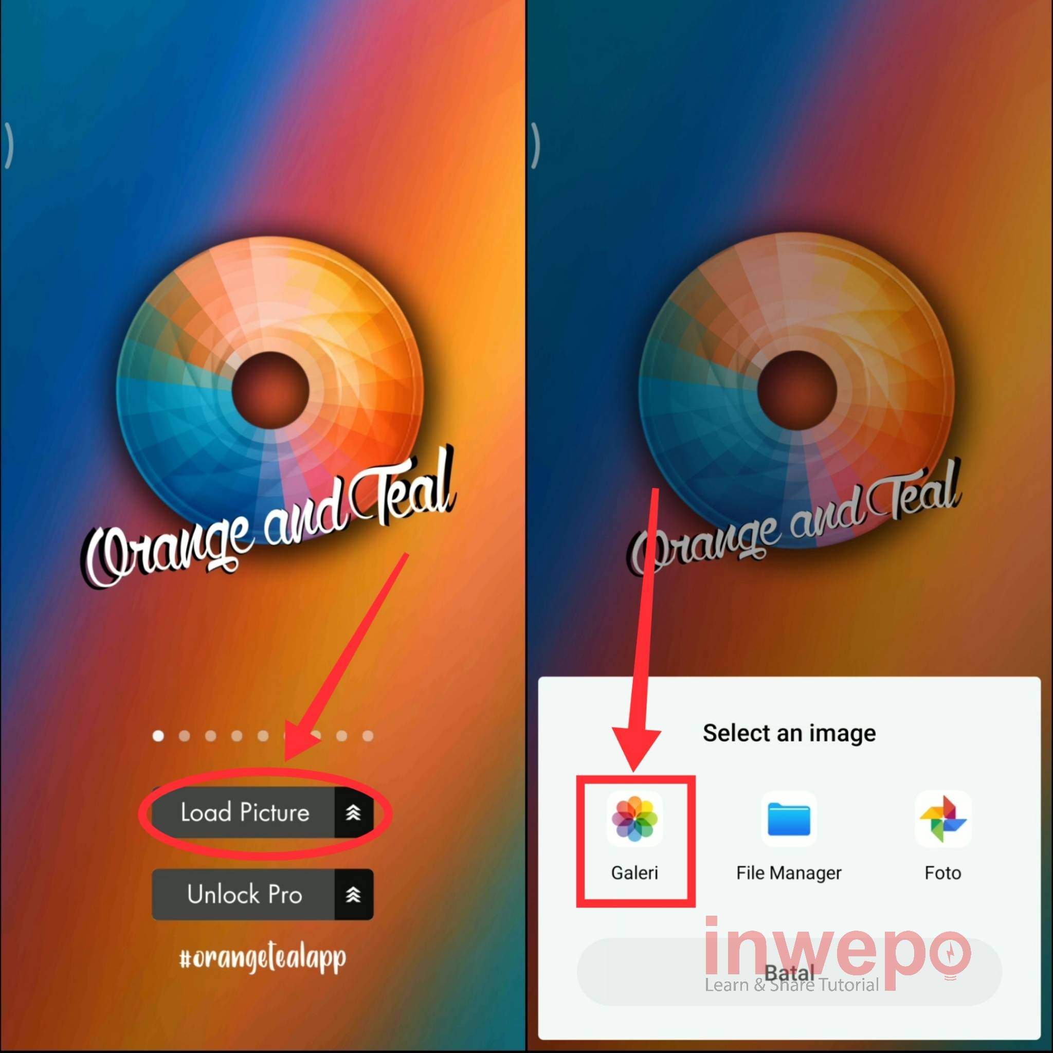 2. Langkah kedua, buka aplikasi Orange Teal dan pilih menu Load Picture untuk menambahkan foto. Selanjutnya pilih Galeri untuk memilih foto dari galeri smartphone.