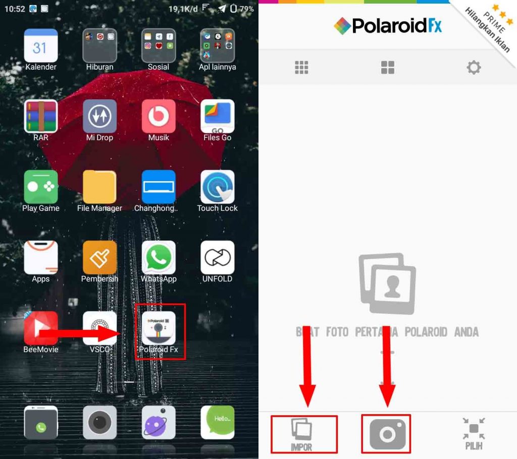 2. Buka aplikasi Polaroid Fx yang sudah terinstall lalu tap icon kamera untuk menambahkan foto langsung dari kamera atau bisa tap IMPOR untuk menambahkan foto yang sudah ada di galeri smartphone kamu.