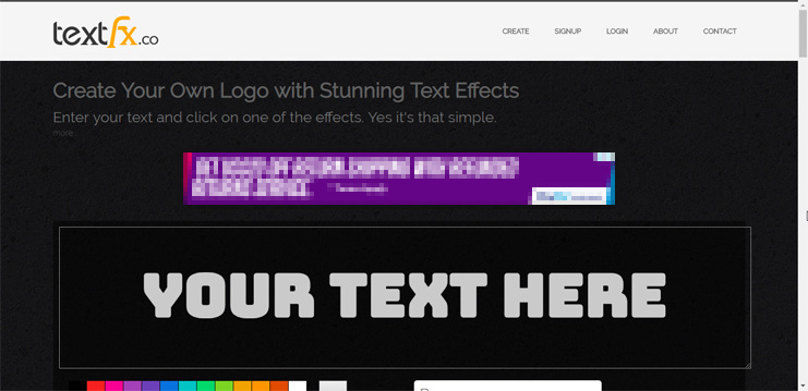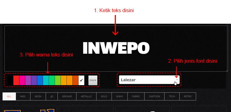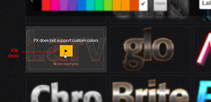 3. Dibagian bawah kotak input teks, kamu bisa memilih warna dan jenis font yang ingin dipakai. Tapi perlu dicatat, beberapa efek teks tidak memperpedulikan warna yang kamu pilih. Contohnya seperti efek api & emas.