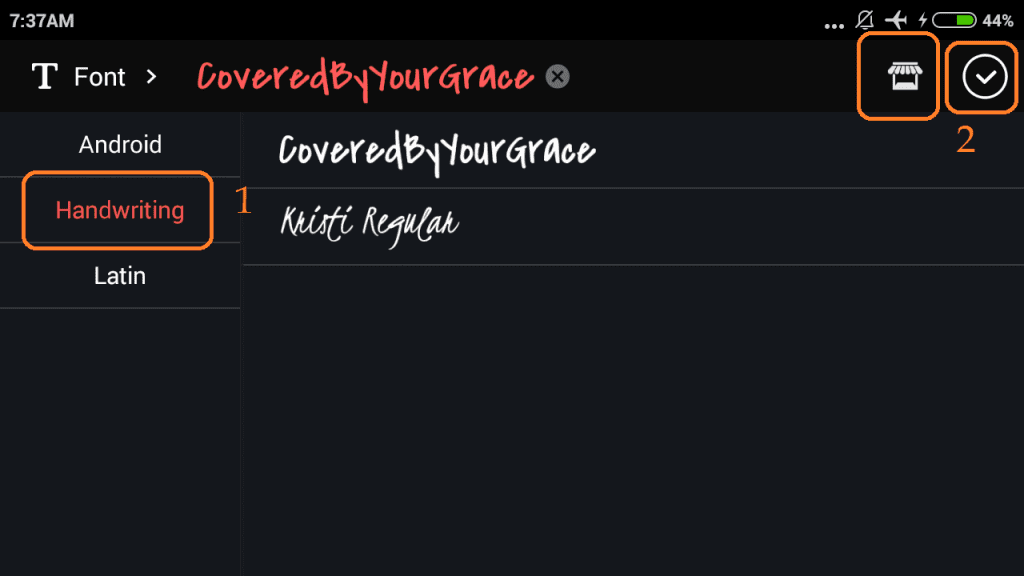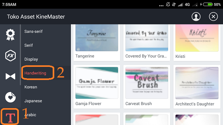Namun, bila di KineMaster kamu belum tersedia jenis huruf handwriting, kamu dapat mengunduh gratis di store KineMaster. Buka store KineMaster, dan pilih ‘Teks’ – ‘Handwriting’.