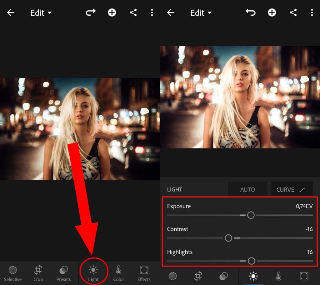 2. Masuk ke aplikasi dan pilih salah satu foto dari galeri untuk di edit. Kemudian pilih pada bagian light dan setting efeknya seperti pengaturan di bawah ini: