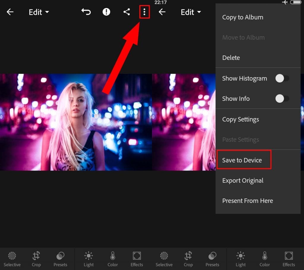 6. Untuk menyimpan, tap pada menu 3 titik di sudut kanan atas kemudian tap save to device.