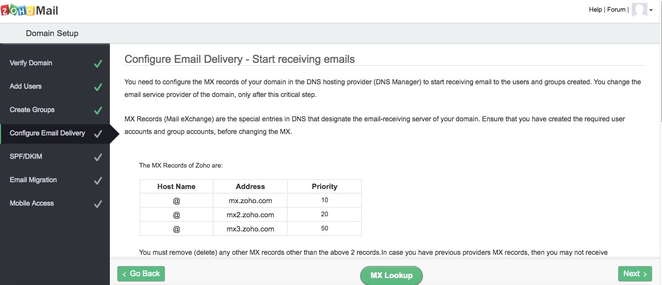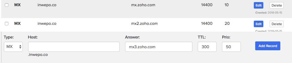 Answer: mx.zoho.com, mx2.zoho.com dan mx3.zoho.com