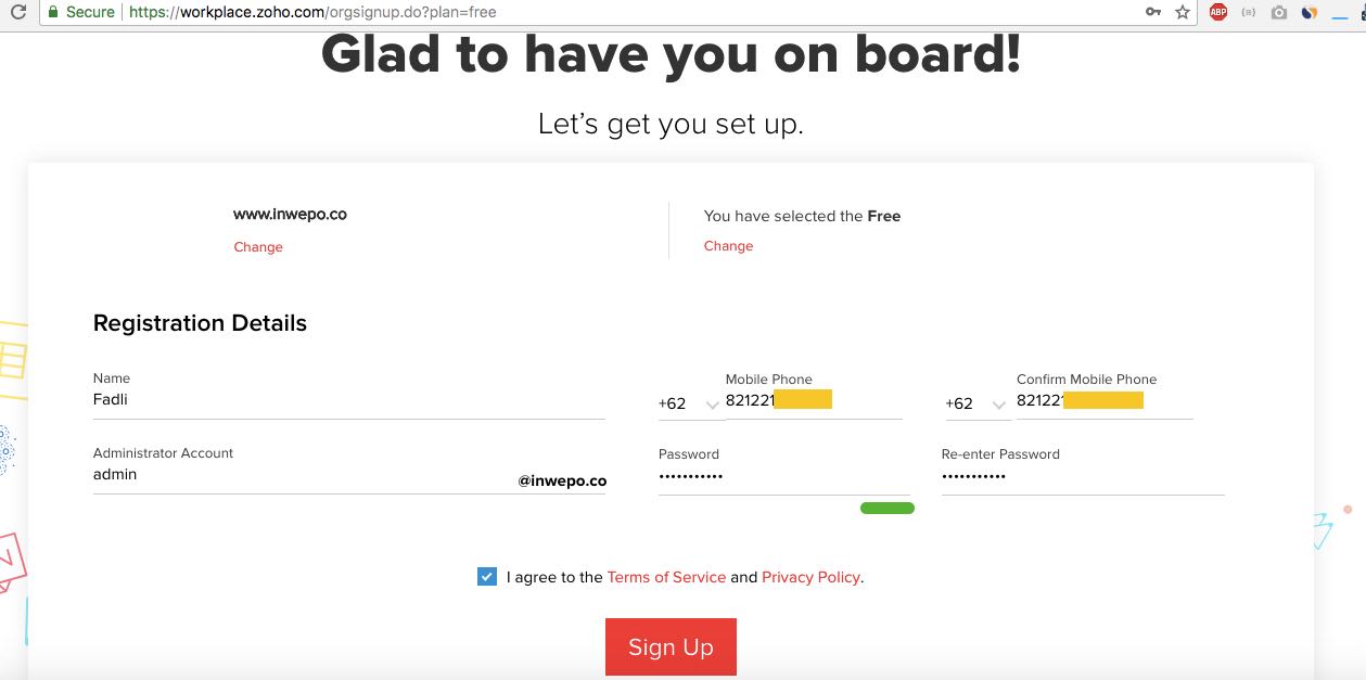 4. Selanjutnya, isikan form pendaftaran seperti nama, password, email admin yang digunakan jadi email custom utama dan nomor telepon untuk verifikasi akun nantinya. Centang i agree to the Term of Service and Privacy Policy lalu pilih SIGN UP.