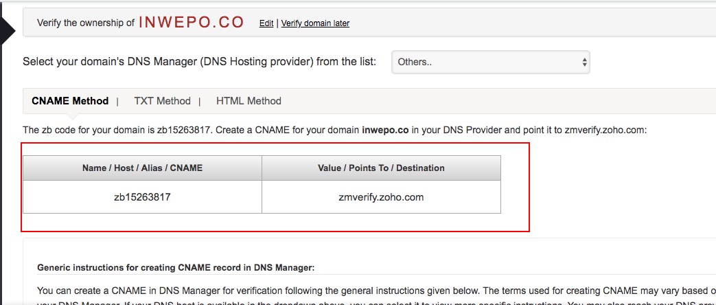 6. Selanjutnya kamu akan diarahkan kehalaman Zoho untuk melakukan Domain Setup, yang pertama kamu harus melakukan verifikasi kepemilkan domain. Pilih salah satu tempat jasa kamu membeli domain, bila tidak ada pilih Others. dibawah halaman tersebut akan diberikan petunjuk singkat bagaiamana cara melakukan verifikasi ke pihak penyedia domain.