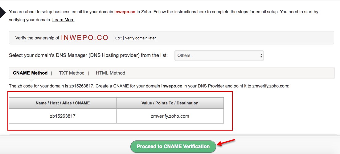 9. Jika sudah ditambahkan selanjutnya kembali lagi ke halaman Zoho setup, klik tombol “Proceed to CNAME Verification“.