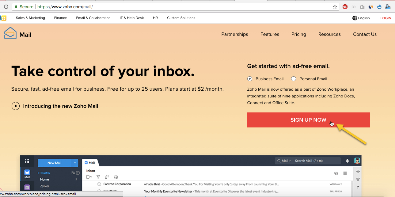 1. Buka situs Zoho mail https://www.zoho.com/mail/ pilih SIGN UP NOW.
