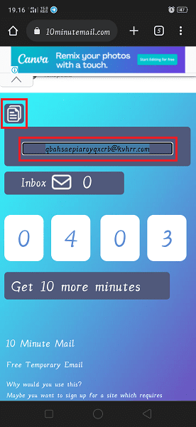 2. Setelah situs 10minutemail terbuka, kamu akan langsung mendapatkan alamat email dengan durasi pemakaian 10 menit saja. Untuk menyalin alamat email tersebut, tap ikon Copy yang ada di sisi kiri atas alamat email. Dan, sekarang kamu bisa menggunakan alamat email tersebut sesuai dengan kebutuhan kamu.
