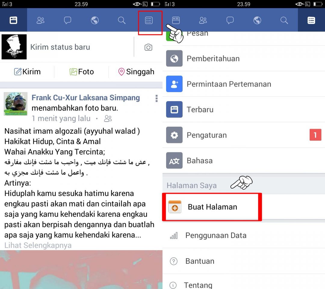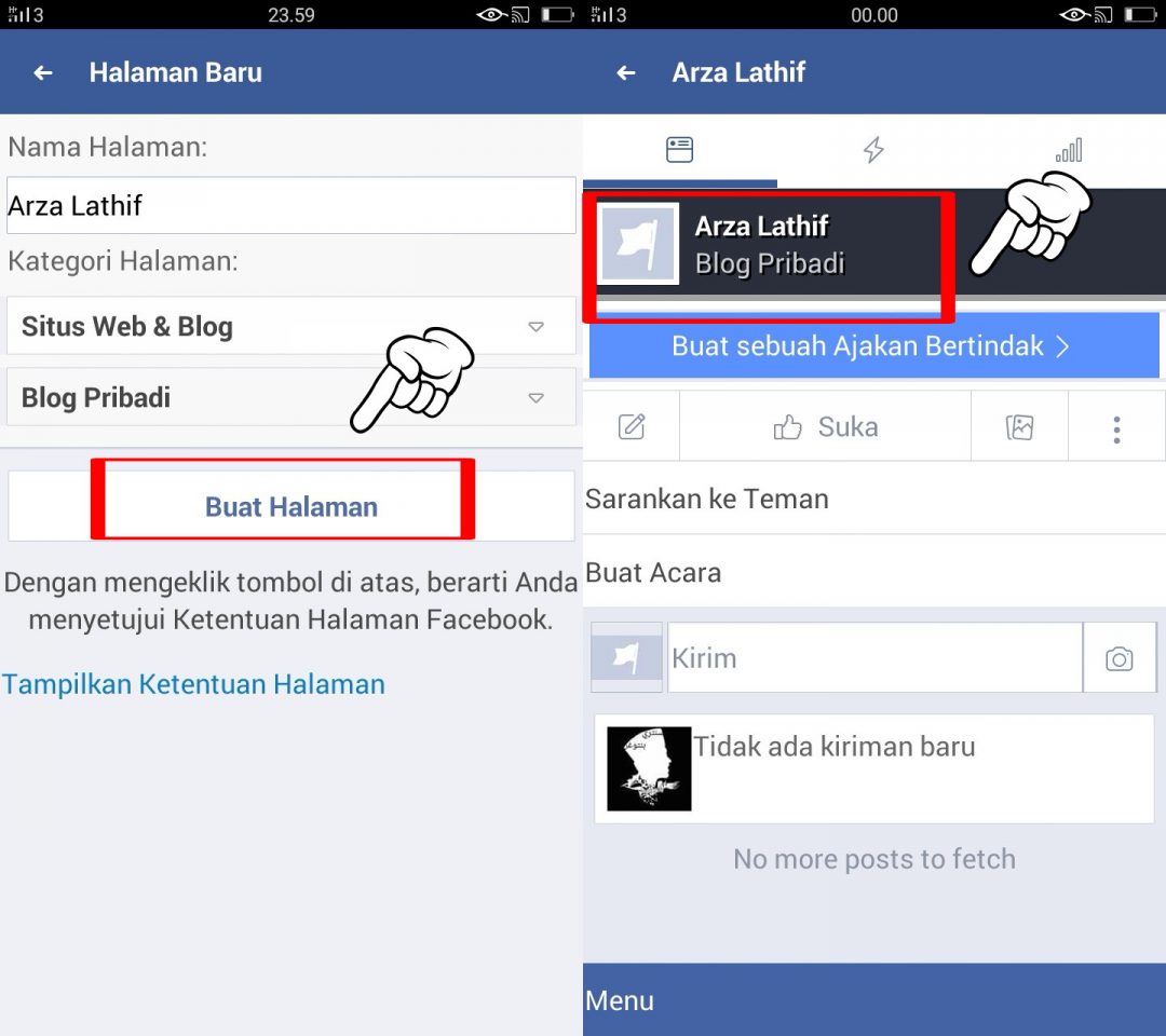 4. Setelah nama fanpage kamu buat, beserta kategorinya, kamu tinggal tap tombol “Buat Halaman”. Dan kamu bisa melihat pada layar ponsel kamu bahwa fanpage sudah berhasil kamu buat. Disana kamu bisa isi dengan konten, dan post yang kamu mau.