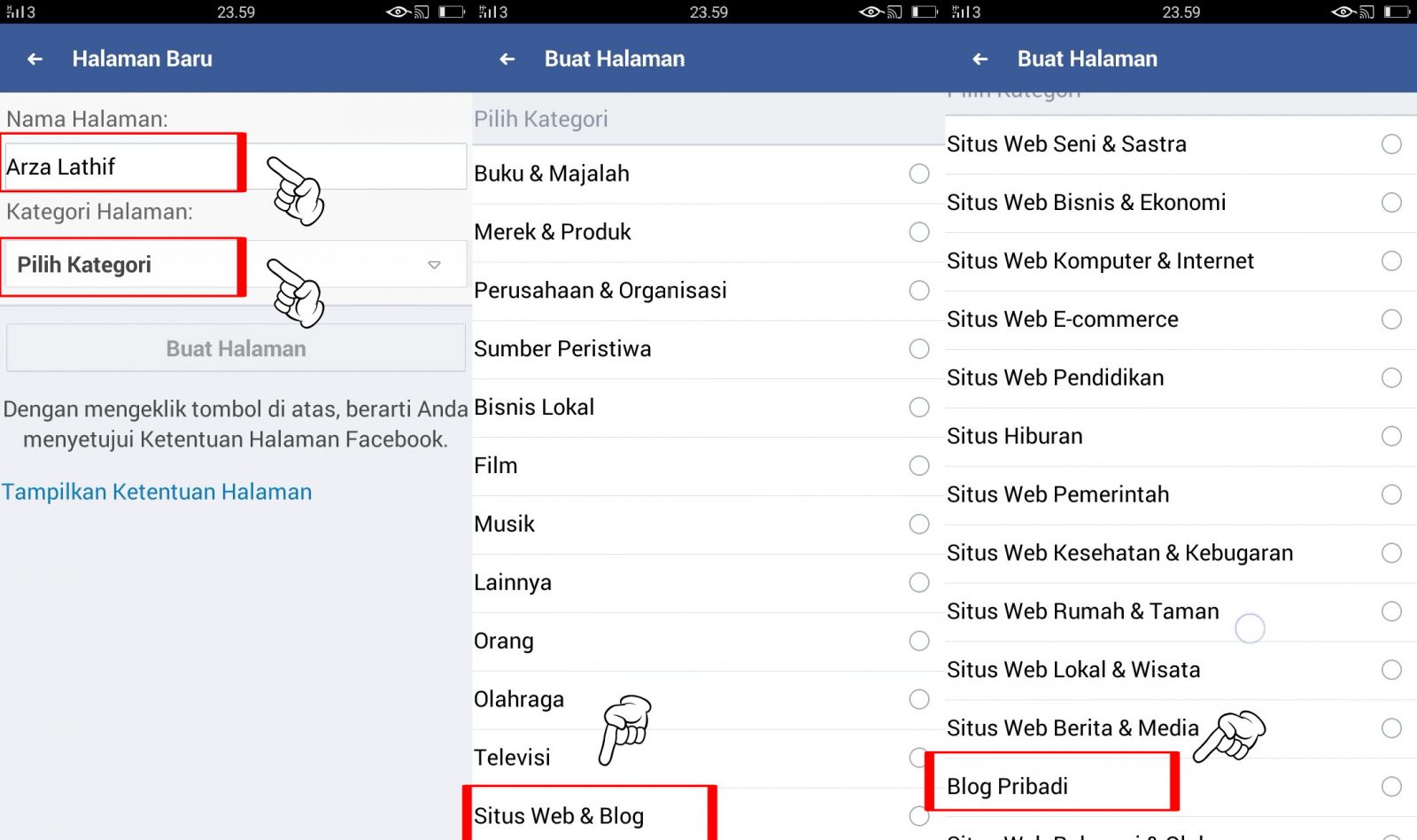 3. Masukan nama fanpage yang kamu inginkan, lalu pilih dan tentukan kategori yang sesuai dengan minat kamu.